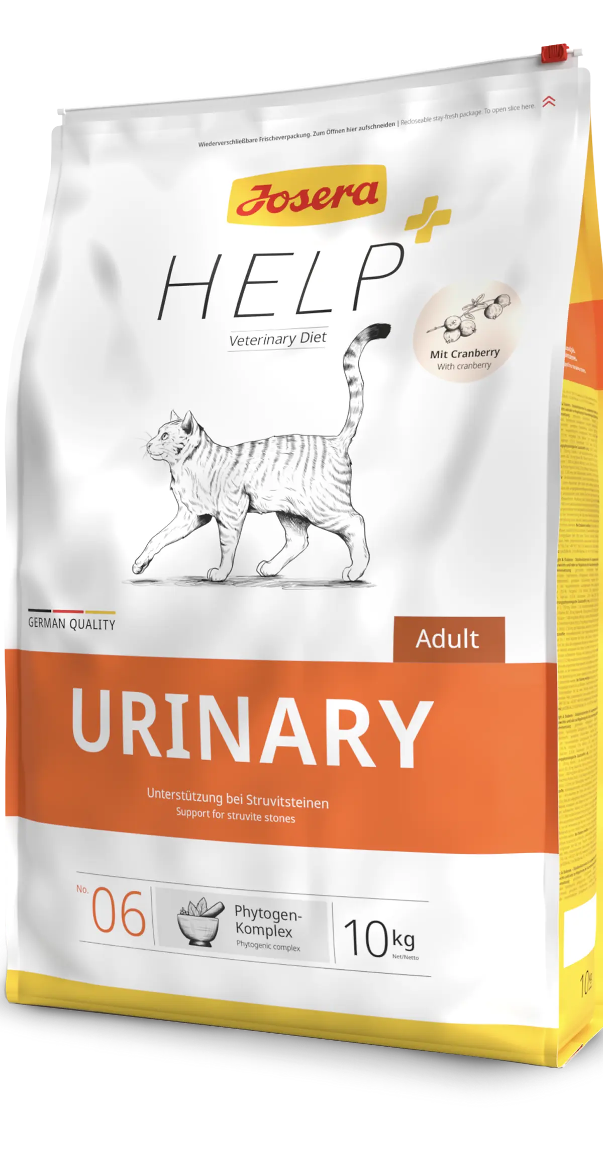 This dry cat food by Josera is formulated specifically for adult cats who have urinary tract issues, particularly the formation of struvite stones. The product aims to support an acidic urinary pH , which helps dissolve existing struvite stones and reduce the risk of new ones forming.It has a tailored mineral composition (lower magnesium, balanced phosphorus & protein) and includes a Phytogen Complex of herbs like cranberry & nettle to support urinary health.Josera Help Urinary Cat is a complete dietary food.