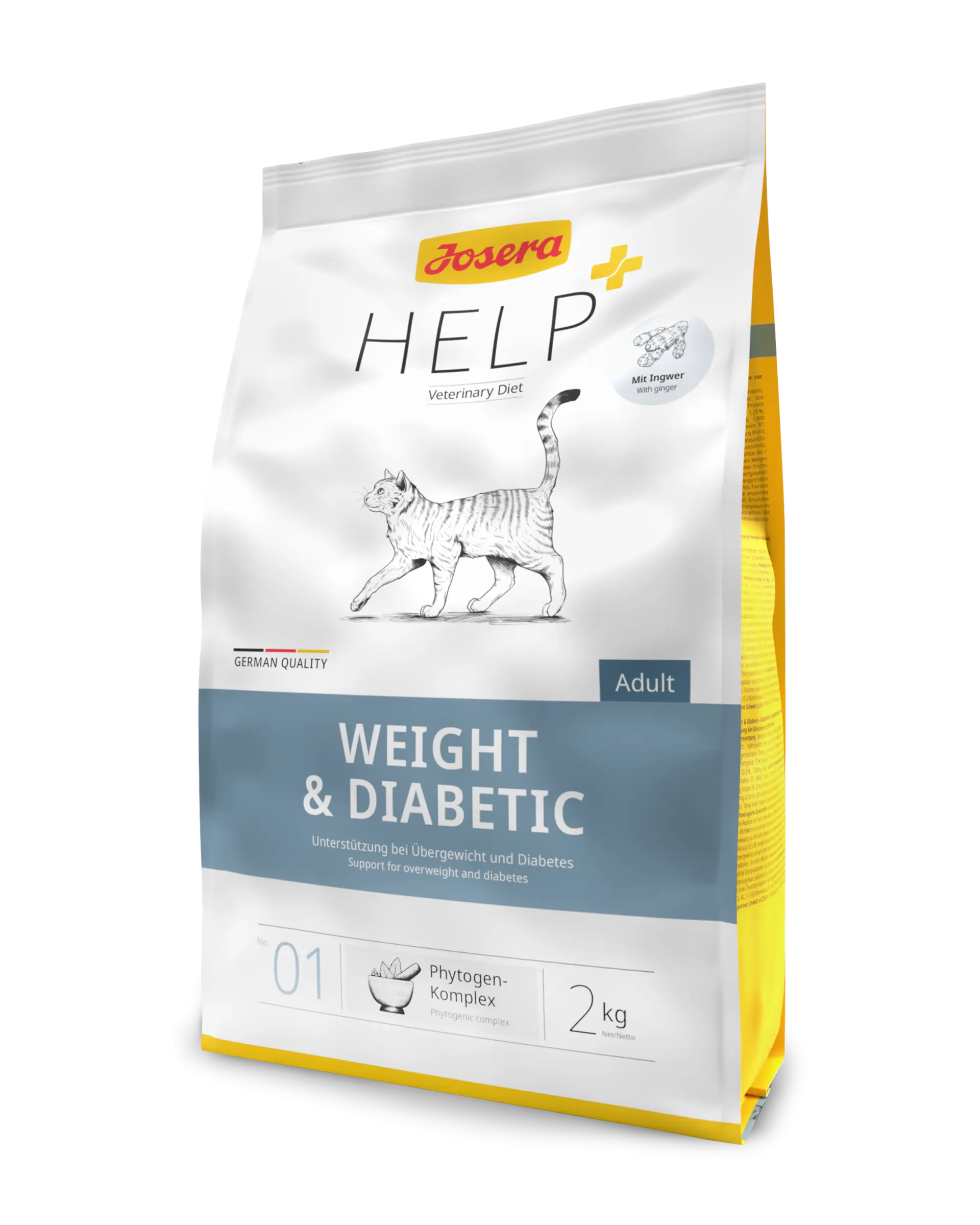 Josera Help Weight & Diabetic is a dietetic, complete dry food specially formulated for adult cats suffering from overweight and/or diabetes mellitus. The recipe features reduced calories and sugar content, increased fibre for satiety, and is designed to support healthy weight reduction or maintenance, as well as help regulate blood glucose levels.