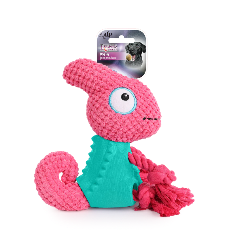 This adorable chameleon toy for dog. Designed to keep them engaged, it features a squeaking head and tail made of plush, sturdy rope legs and arms, and a durable natural rubber body. It's sure to provide hours of fun while hiding tasty treats for your furry friend!