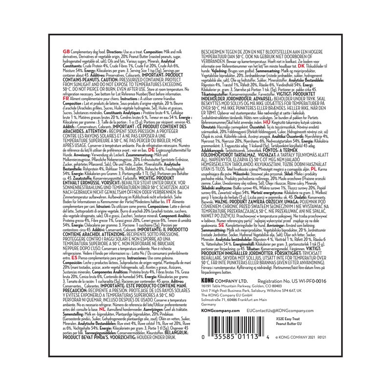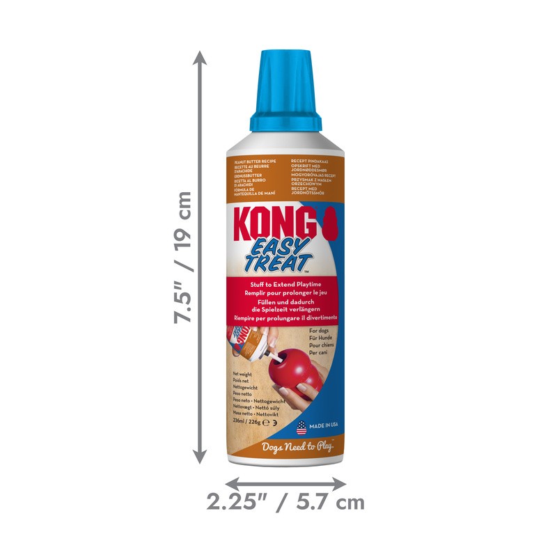 KONG Peanut Butter Easy Treat™ is a delicious treat that delights all types of dogs while providing an easy no-mess solution for pet parents. Made in the USA, this highly-digestible and trans-fat free treat is an enticingly delicious addition when added to a stuffed KONG. A uniquely designed nozzle easily controls the amount of KONG Easy Treat™ while also having the added benefit of a convenient, no mess stuffing solution.