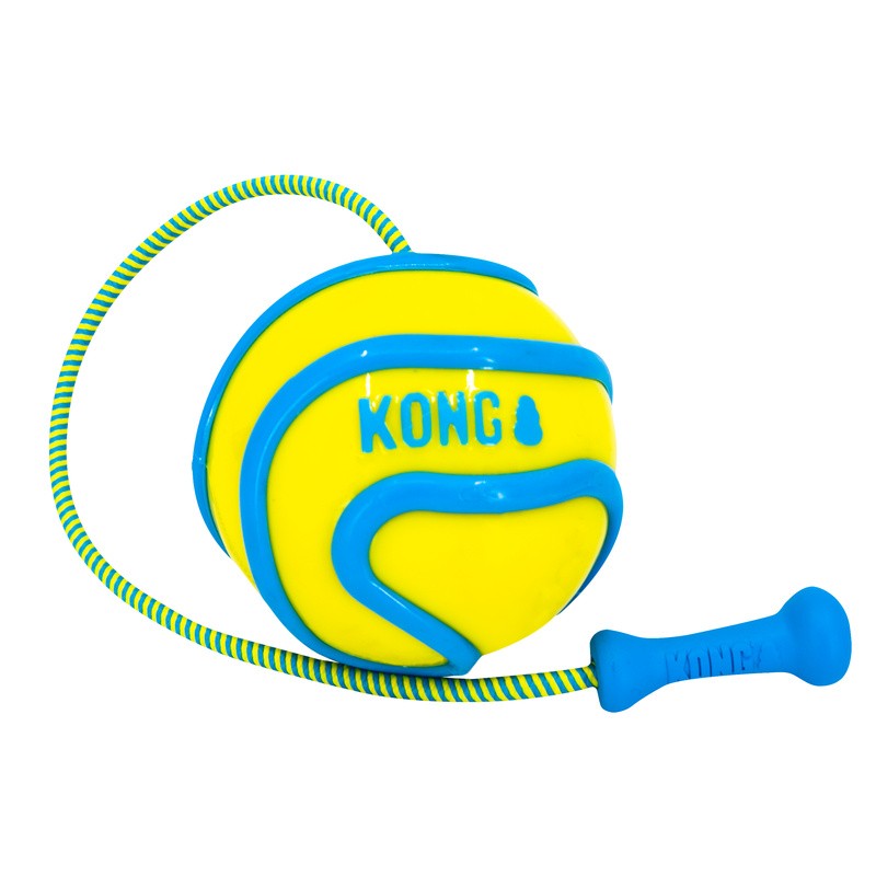 The KONG Wavz Bunji Ball is designed for long-distance fetching fun with a unique bungee rope that combines with a fun and vibrant textured ball.