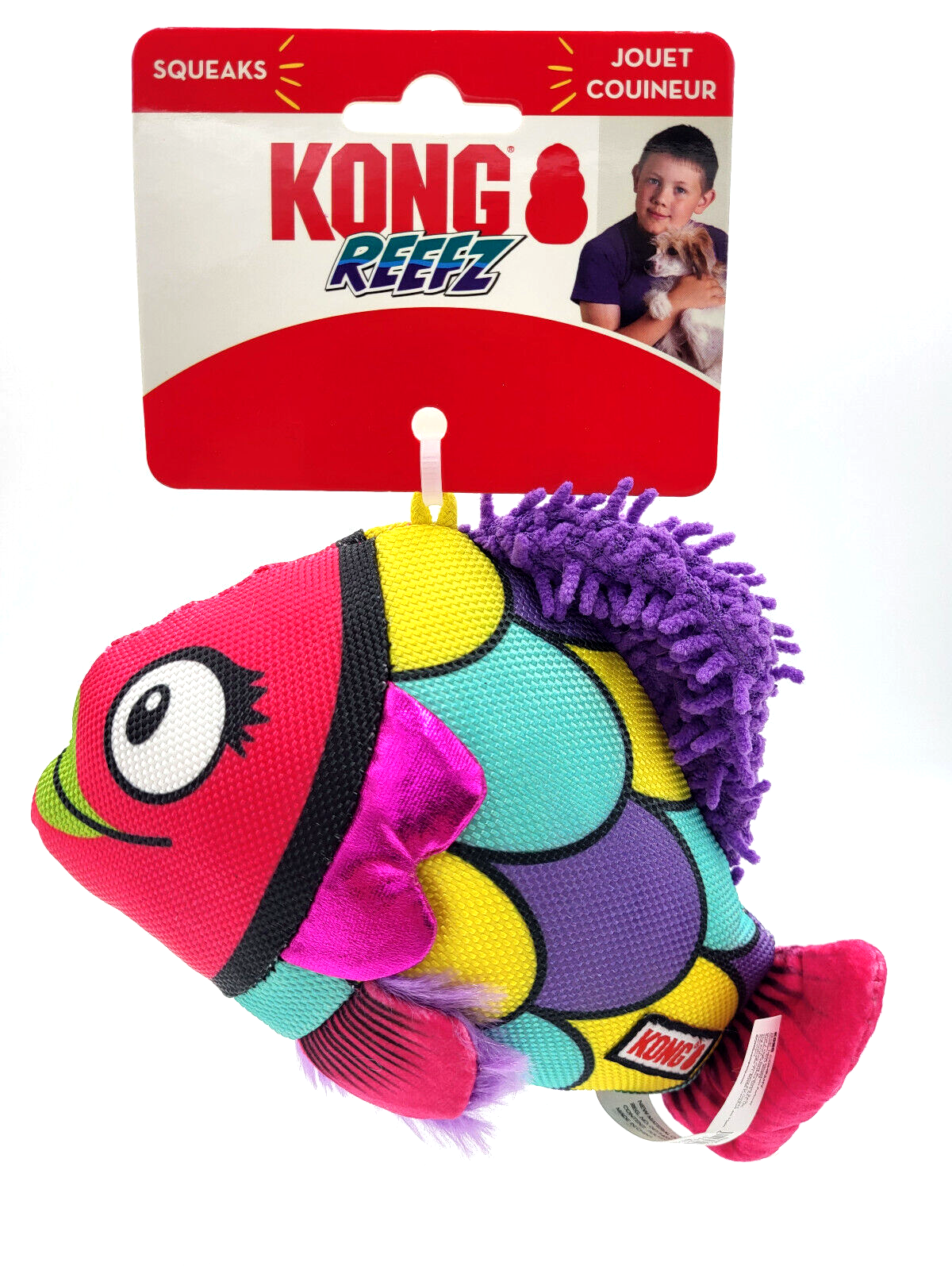 KONG Reefz sport multiple textures that reward instinctual chewing behaviors. The durable KONG Ballistic material and flat, floppy bodies spark thrashing fun. Squeakers make sure dogs take the bait and keep playing with their irresistibly shiny aquatic friends.