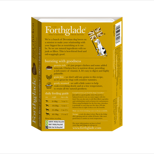Forthglade Just Chicken & Liver is a nutrient packed complementary wet meal for your dog. With 90% chicken with liver this food is rich in protein and also grain free and hypoallergenic, making it ideal for dogs with sensitive tummies. Simply add Forthglade chicken and liver to any good quality mixer to create the perfect balance. Gently steamed to retain as much of the natutal goodness and flavour as possible.
