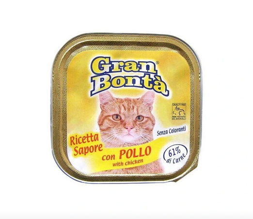 GRAN BONTA pâté with chicken for cats 100g, a complete food that represents the pinnacle of quality and taste that your cat adores. This product is made from high-quality ingredients, including 61% meat and products of animal origin, ensuring that your cat receives all the essential nutrients for a healthy life. Thanks to the carefully balanced composition, including vitamins, minerals and the optimal amount of fiber, GRAN BONTA is not only a tasty, but also a nutritious option for your cat. Additionally, with a humidity of 81.5%, this product provides an important hydration that is crucial for maintaining your cat’s health.