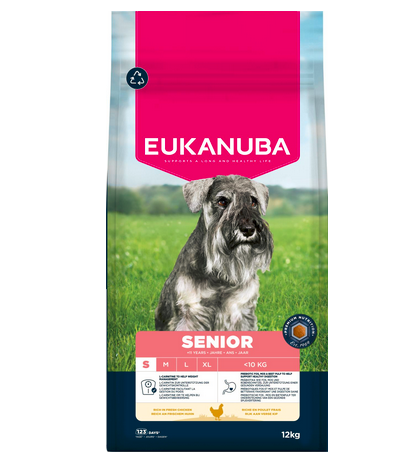 Eukanuba dry food is rich in fresh chicken and perfect for senior dogs of small breeds aged 11 years and up. The selected ingredients provide a carefully tailored nutrition that increases your senior dog's optimal body condition and active mobility.