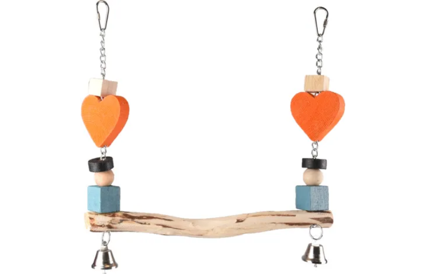 Make your bird happy with this cool hanger in the shape of a walkway! Made of wood and finished with fun accents. Can also be used as a swing and has two bells for extra fun.