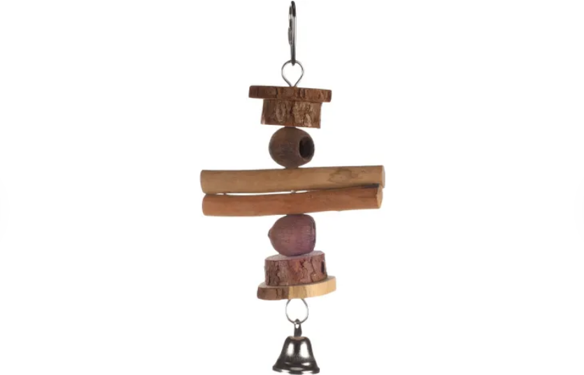 Treat your budgie to the Akir Brown toy! Made from wood and mahogany, with beads and sticks to nibble on. The jingling bell adds extra fun. Easy to hang with the metal hanging system.