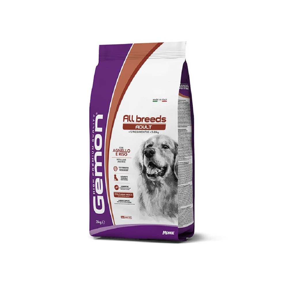 GEMON ALL BREEDS ADULT WITH LAMB AND RICE is a complete pet food for adult dogs of every size. The formulation is characterised by top quality ingredients like lamb, a source of essential nutrients, and rice, a source of carbohydrates. The recipe is made highly digestible thanks to the extrusion process. A balanced diet with prebiotics, such as fructo-oligosaccharides (FOS), and beet pulp, source of insoluble fibres to support the regular functioning of the intestinal tract. It contains fresh meat for optimal palatability and L-carnitine to support muscle mass. It also contains yucca schidigera to limit intestinal odors. No added artificial dyes and preservatives.