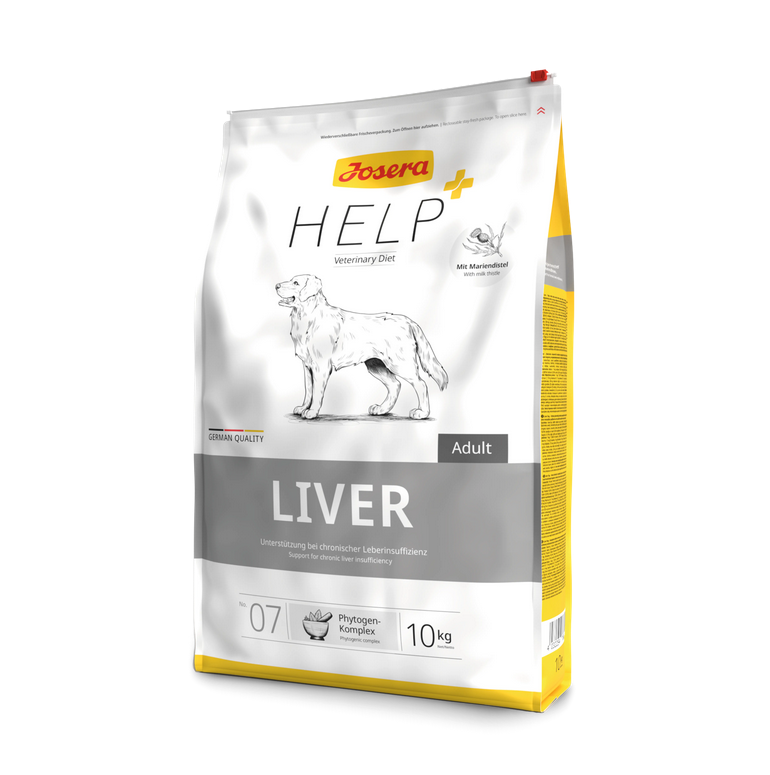 If your beloved pet suddenly loses their appetite, seems apathetic and experiences weight loss, this may in some cases be due to chronic liver failure: our Josera Help Liver dry food has been developed for this scenario! This dietary complete feed is custom designed with a special recipe to provide optimal nutrition for dogs with liver disease. Josera Help Liver contains valuable milk thistle. This is traditionally used to support liver function and can help prevent excessive strain on the liver. Vitamin C and other valuable antioxidants can protect against free radicals. L-carnitine helps the fat metabolism. The reduced protein and copper content in turn is important to take the strain off organs that are vital for metabolic processes. If a dog has been diagnosed with chronic liver failure, there are a couple of dietary adjustments that can help improve your pet's health: the key thing is to reduce the supply of protein and copper and avoid offering snacks containing lots of connective tissue. The best approach is to offer lots of smaller meals with the dietetic feed spread throughout the day. Together we can combat ill health to ensure an enjoyable life for your dog.
