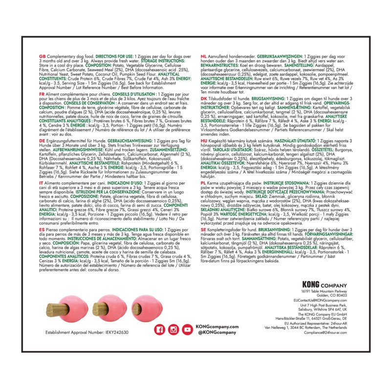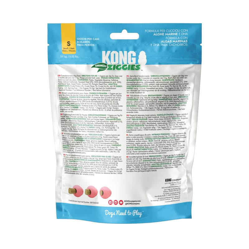 KONG Ziggies Puppy are naturally delicious chews. Perfect for supporting oral health and teething from the start. Our plant-based formula contains seaweed and is enriched with DHA, a form of Omega-3 fatty acids that supports healthy brain development. Ziggies Puppy’s softer texture is easy on the tummy and designed to massage puppy teeth and gums for teething relief, while helping to remove plaque and promoting fresh puppy breath through the mechanical action of chewing. Naturally delicious ingredients give this treat an irresistible flavor puppies love without added wheat, corn or soy. KONG Ziggies Puppy chews are ideal given as a treat and for stuffing inside KONG Puppy rubber toys for a fun way to extend daily dental care.