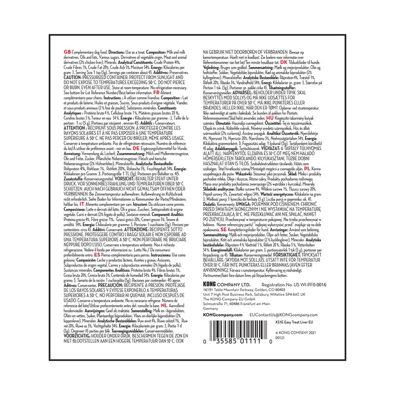 KONG Liver Easy Treat is a delicious treat that delights all types of dogs while providing an easy no-mess solution for pet parents. Made in the USA, this highly-digestible and trans-fat free treat is an enticingly delicious addition when added to a stuffed KONG. A uniquely designed nozzle easily controls the amount of KONG Easy Treat while also having the added benefit of a convenient, no mess stuffing solution.