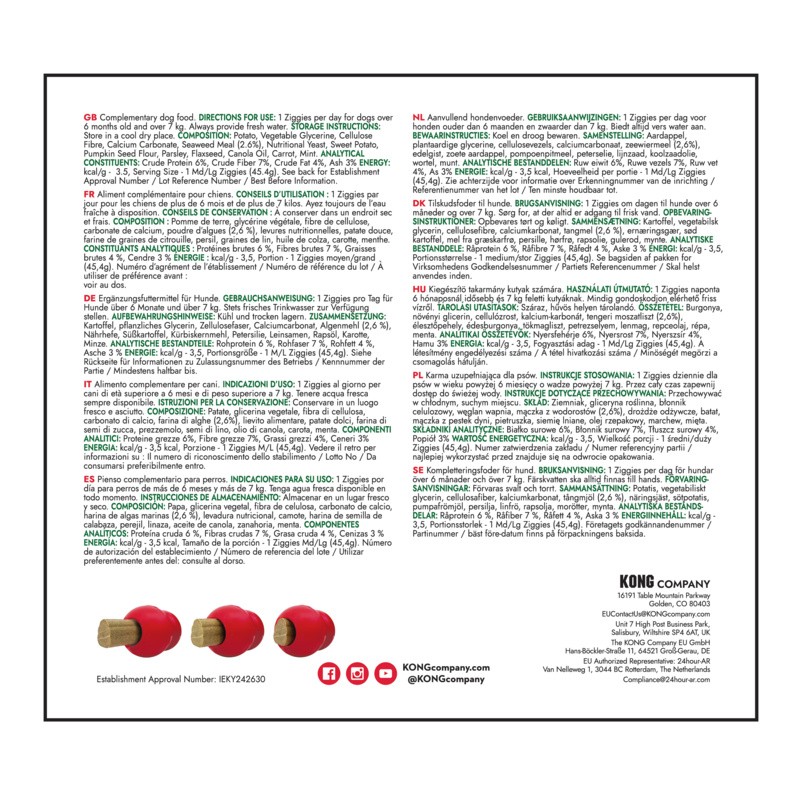 KONG Ziggies naturally delicious chews are made to support dogs’ oral health by helping to remove and prevent plaque buildup through the mechanical action of chewing and promoting fresh breath. Enriched with PhytoDent™ seaweed that’s packed with antioxidants, vitamins, minerals, and proteins, these plant-based treats have an irresistible flavor dogs love. Ziggies are ideal as a treat or for stuffing inside a KONG Classic for a fun way to extend daily dental care. No added wheat, corn, or soy.