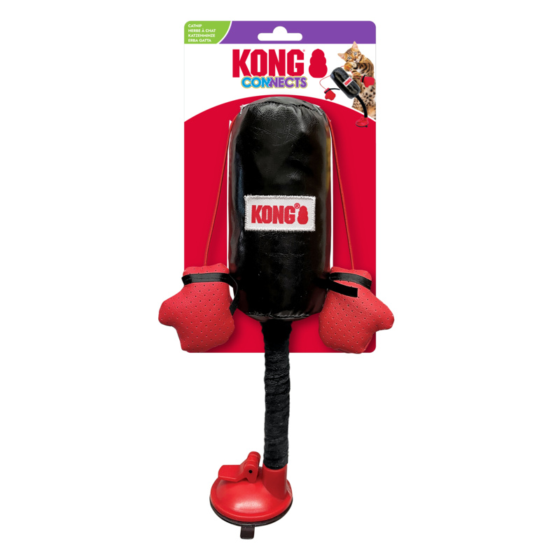 Secure the base onto any smooth surface with the locking suction cup and the spring-loaded punching bag bobs an irresistible invitation with dangling boxing gloves that attract the eye of the (small) tiger to bat and grab. KONG Premium North American Catnip in gloves fuels extra rounds of fun, while bells and crinkles spark hunting instincts.