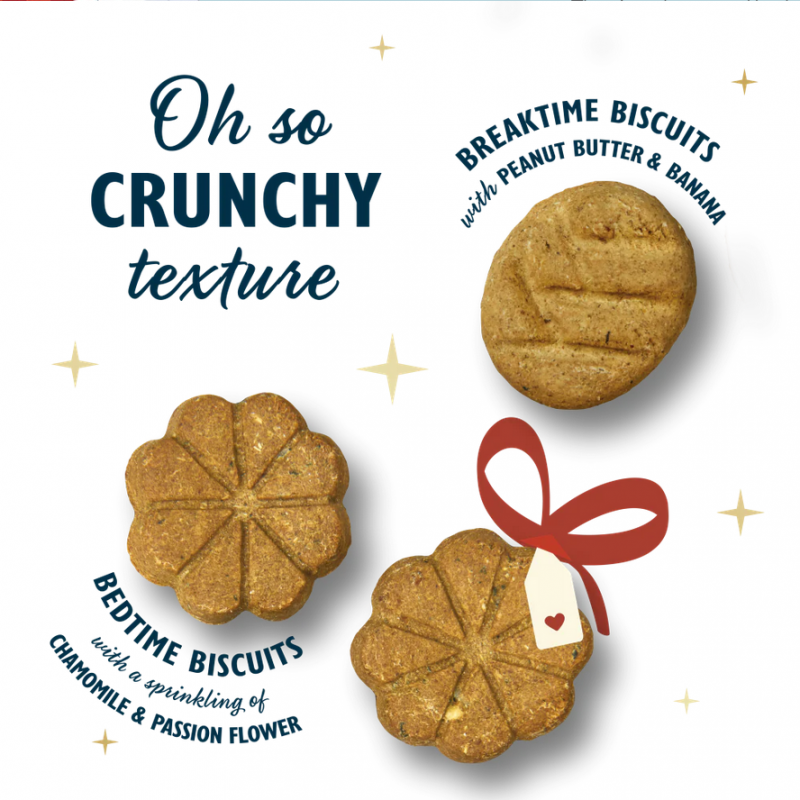 Breaktime Biscuits with peanut butter and banana. Bedtime Biscuits with a sprinkling of chamomile and passion flower.