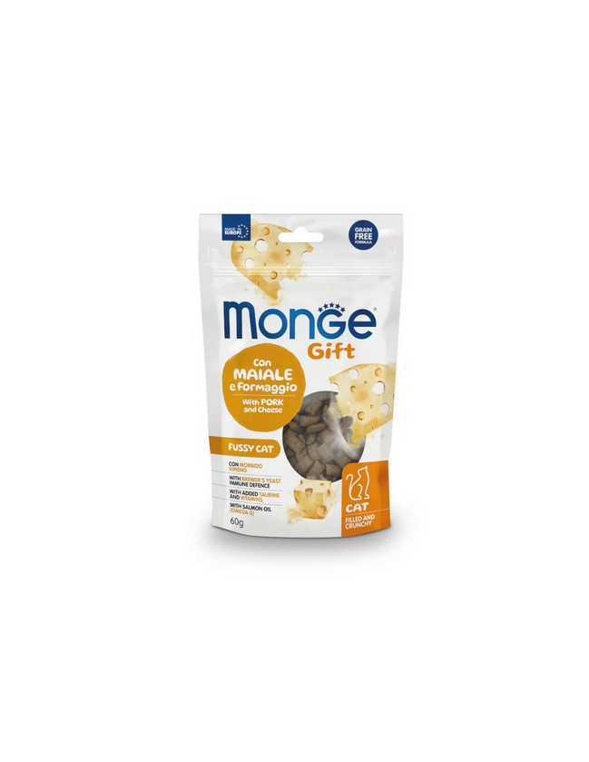 MONGE GIFT FUSSY CAT WITH PORK AND CHEESE is a complementary pet food for adult cats. Specifically developed for the well-being of your cat thanks to an external crunchy layer to support dental hygiene and a soft cheese filling to stimulate the most sophisticated palates. A product formulated without cereals and with pork to optimise food palatability and digestibility. The formulation is enriched with taurine to support visual acuity and a regular heart function and with vitamins for daily vitality. The inclusion of functional ingredients, such as brewer’s yeast to support the body’s defense system, and salmon oil, a source of omega 3, is the result of Made in Italy research. No added artificial preservatives and sugars.