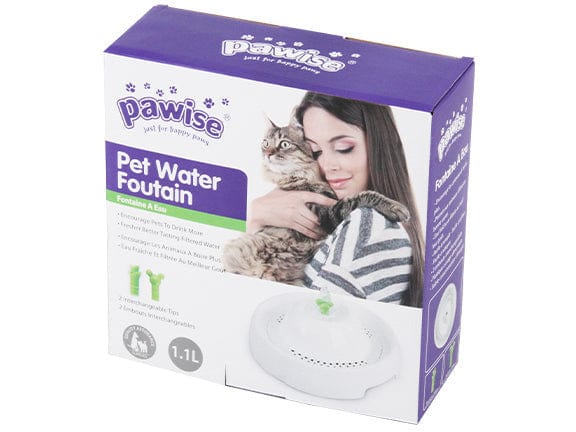 The Pawise Pet Water Fountain (1150 ml) is a continuously circulating pet water dispenser designed especially for cats (but may be suitable for small dogs).It aims to keep the water clean, fresher, and more attractive than static bowls.It has a compact, ergonomic design, adjustable flow, and a height suitable for pets of various sizes.The device is powered by a pump and must be connected to a safe power source (electric).