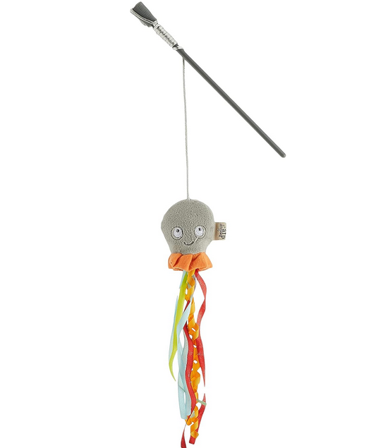 At the end of a handle or flexible stick hangs an octopus-shaped teaser with ribbons, pompoms, and feathers — all constructed to flutter, twirl, and invite playful swats.