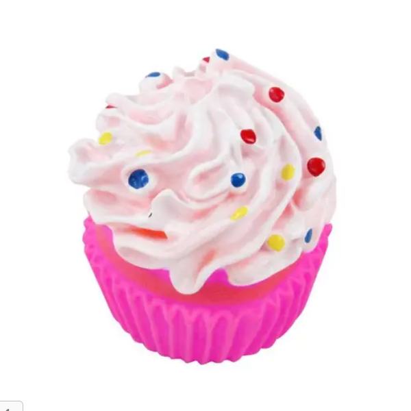 Fun vinyl dog toy shaped like a cupcake with sprinkles, designed for playful chewing.