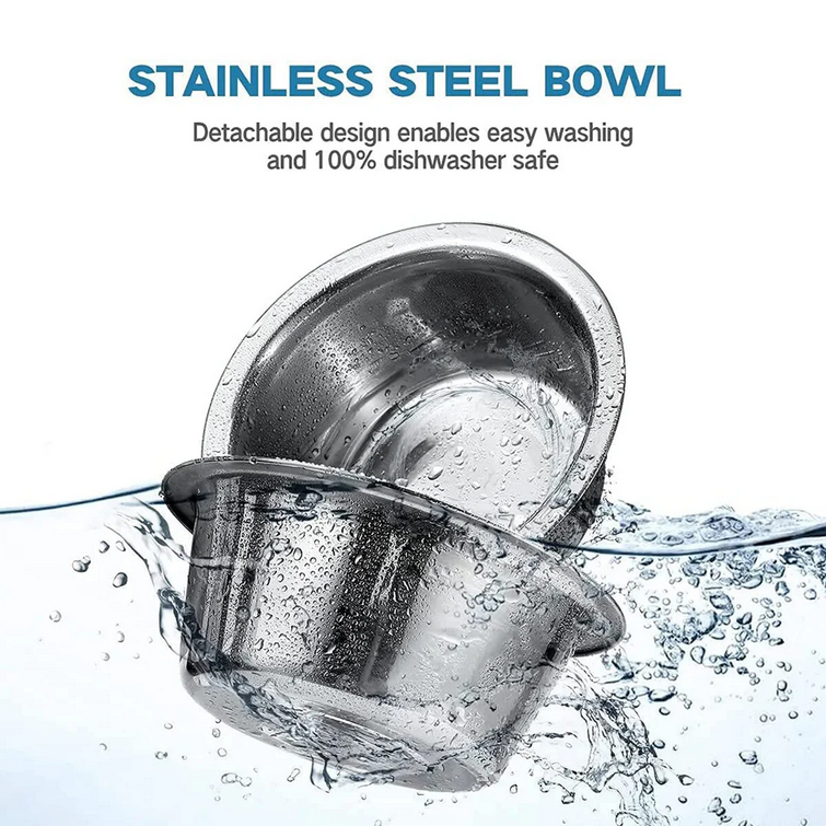 Removable stainless steel bowls are dishwasher safe, resisting rust and making sanitation a breeze.