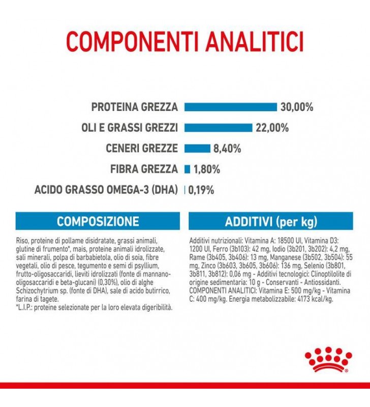 Rice, dried poultry protein, animal fat, wheat gluten*, corn, hydrolyzed animal protein, metals, dried beet pulp, soybean oil, lignocellulosene, fish oil, psyllium (cells and seeds), fructooligosaccharides, hydrolyzed yeast (source of oligosaccharides *L.I.P.: Selected proteins for their very high digestibility.