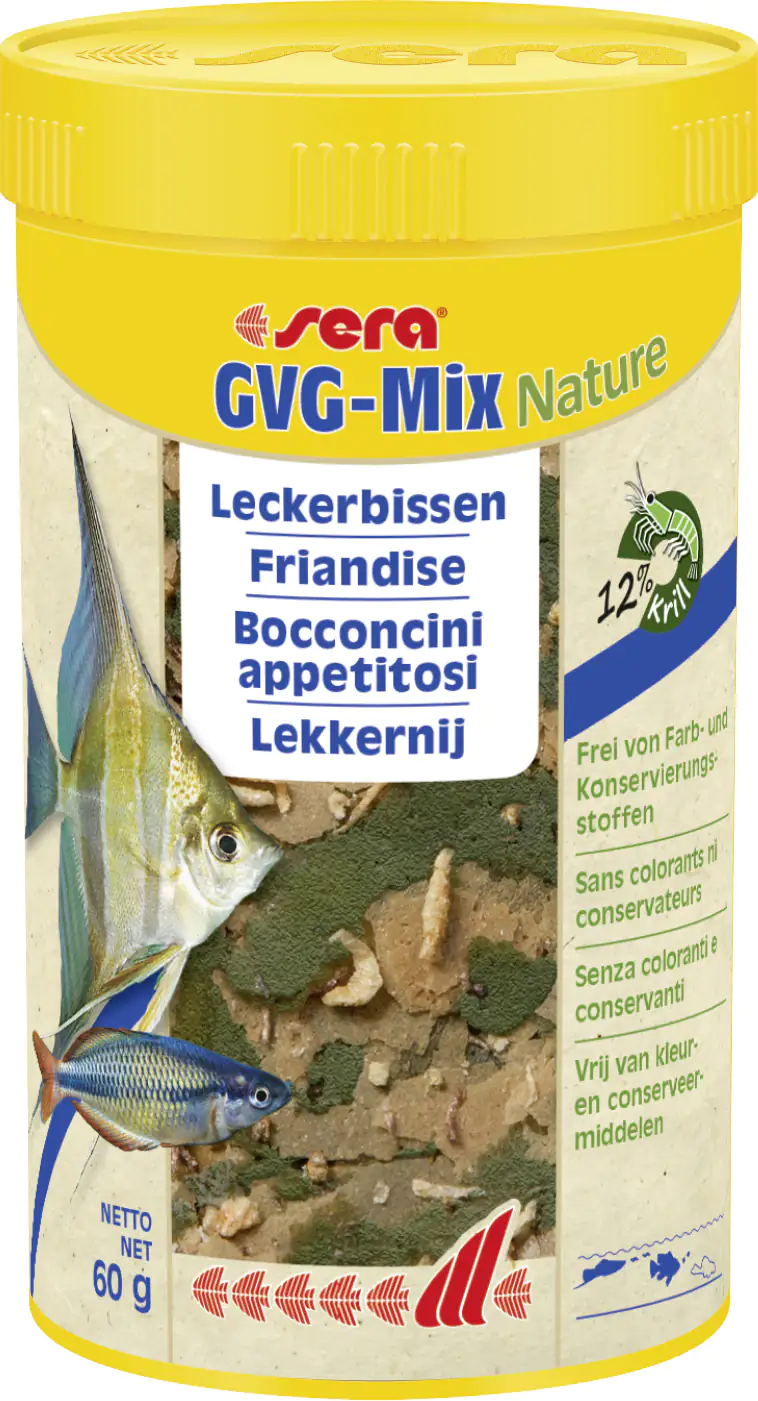 For rearing juvenile fish: Every other day add 1 – 5 drops (depending on the number of fish fry and the food amount) onto sera Micron, sera Vipan Baby or sera Vipagran Baby. Blend briefly and put the food paste into the rearing tank. Complementary feed for all ornamental fish Feeding guide