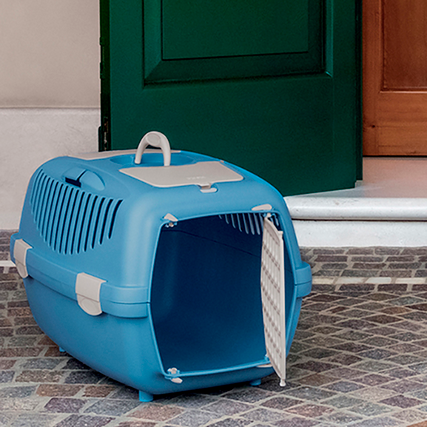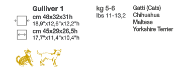 Gulliver 1 is a practical and versatile carrier suitable for cats and small sized dogs. It has side slits to guarantee a correct inside aeration, a plastic door that can be closed from the outside with clips, build in seat belts slots and an ergonomic handle. There are different colours available. It is safe for pets, easy to assemble, and clean and perfect to travel with your loyal friend on the most common means of transportation.
