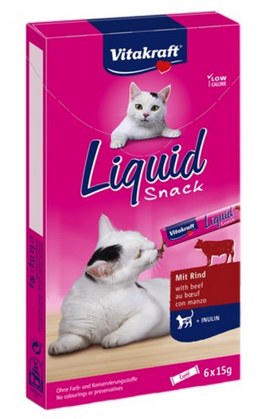 Vitakraft Cat Liquid-Snack with Beef & Inulin is a functional, low-calorie treat designed to support a cat's digestive health while providing a highly palatable snack