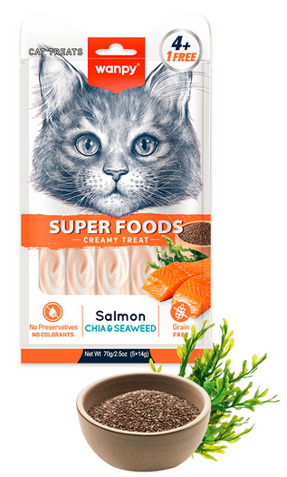 The Wanpy Cat Superfoods Creamy Lickable Salmon with Chia & Seaweed offers several functional health benefits, primarily focusing on skin and coat health, hydration, and digestive support.Omega-3 & Omega-6 Fatty Acids  Sourced from salmon, tuna, and added fish oil, these essential fats are critical for nourishing the skin and reducing inflammation.The inclusion of seaweed provides natural minerals that further support skin pigmentation and overall vitality. With a moisture level of 90%, this treat helps increase a cat's daily water intake, which is vital for maintaining healthy kidney function and preventing urinary tract issues.The smooth puree format is easy to lick, making it an excellent hydration source for senior cats or those with dental sensitivities.These act as a "superfood" source of fiber and antioxidants, aiding in smoother digestion and providing a nutrient boost.The liquid meat paste is designed to be gentle on the stomach and is easily absorbed, making it suitable for kittens over 3 months and cats with sensitive systems.